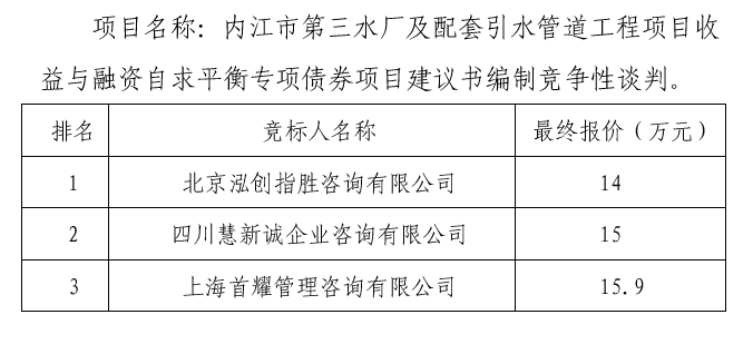 內江市第三水廠及配套引水管道工程項目收益與融資自求平衡專項債券項目建議書編制談判結果公示