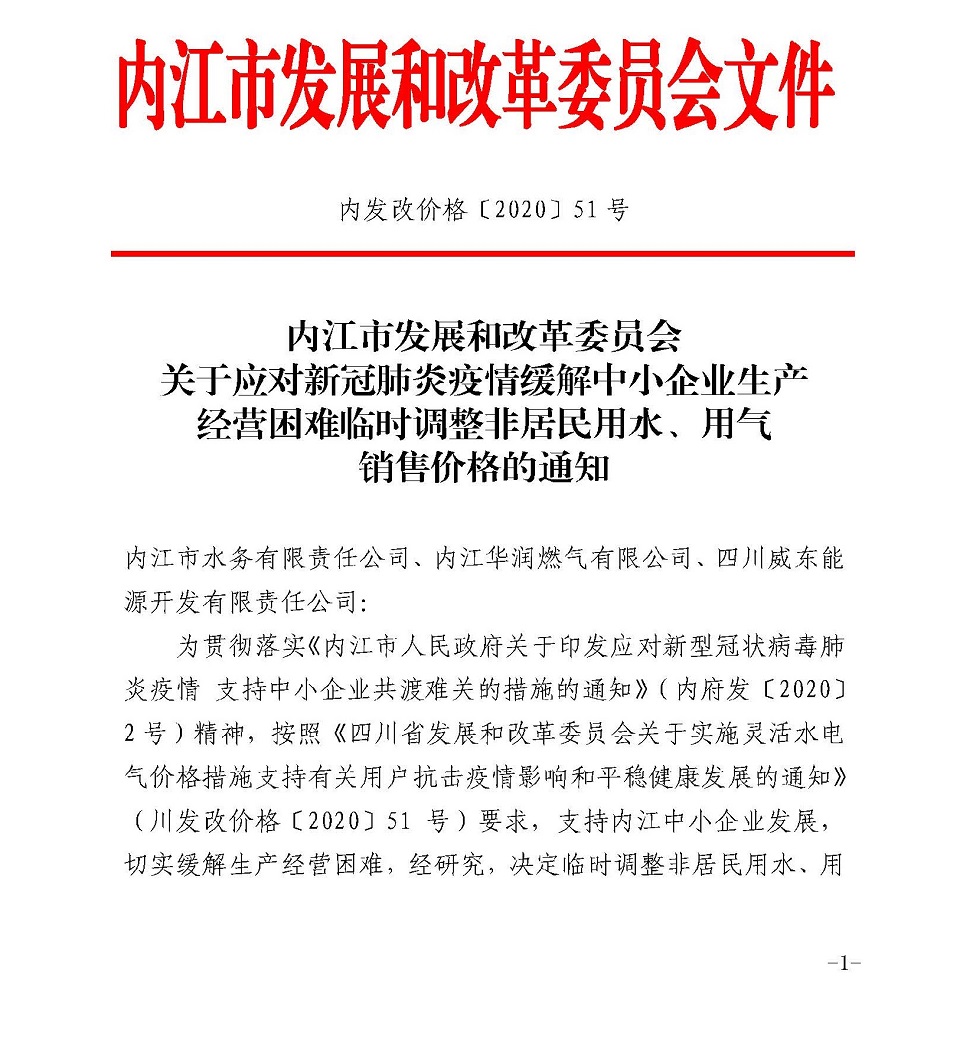 內(nèi)江市發(fā)展和改革委員會(huì)關(guān)于應(yīng)對(duì)新冠肺炎疫情緩解中小企業(yè)生產(chǎn)經(jīng)營(yíng)困難臨時(shí)調(diào)整非居民用水、用氣銷售價(jià)格的通知