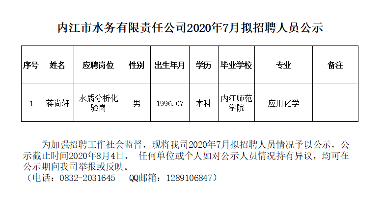 內(nèi)江市水務(wù)有限責(zé)任公司2020年7月擬招聘人員公示