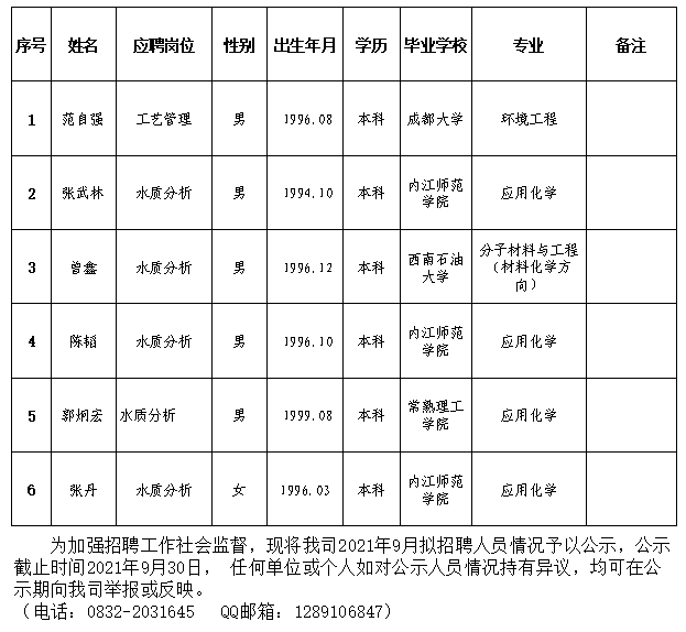 內(nèi)江市水務(wù)有限責任公司2021年9月擬招聘人員公示