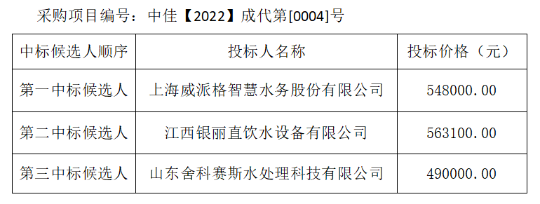 內(nèi)江市水務(wù)有限責(zé)任公司東湖御景小區(qū)集中式管道直飲水成套設(shè)備及附件采購(含安裝)項(xiàng)目評標(biāo)結(jié)果公示