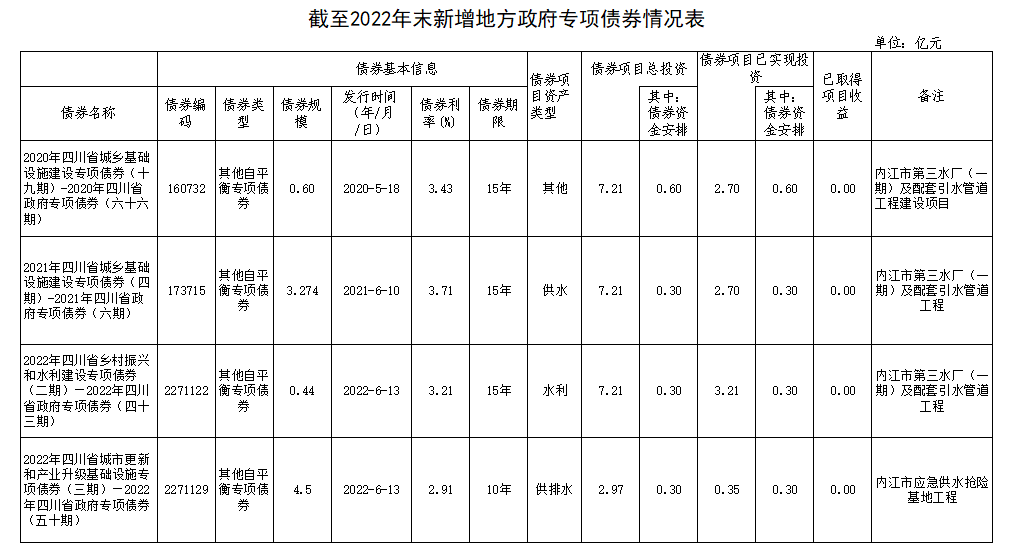 內(nèi)江市本級截至2022年末新增地方政府債券存續(xù)期信息公開(水務)