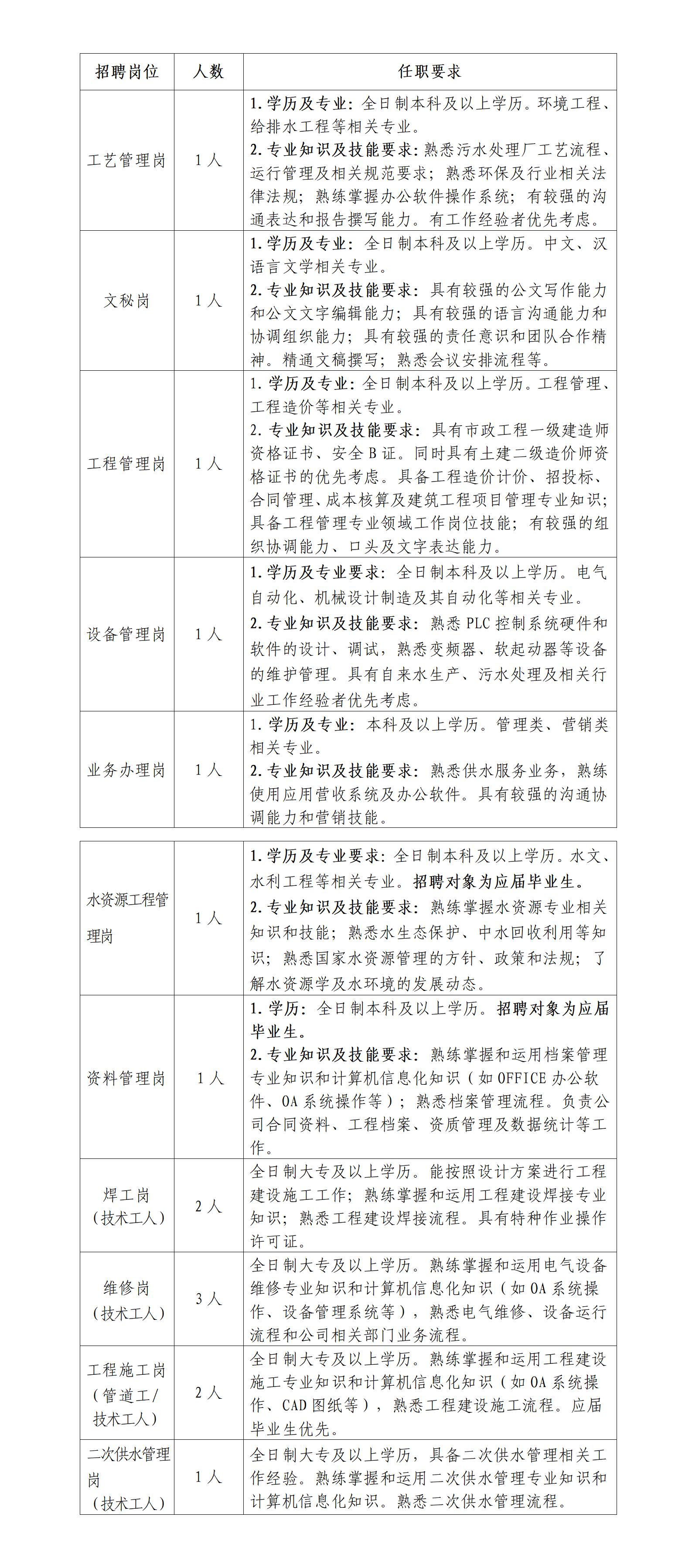 內(nèi)江市水務(wù)有限責(zé)任公司系內(nèi)江市國(guó)資委所屬內(nèi)江投資控股集團(tuán)有限公司的全資子公司。是集城市供水、污水處理、供排水工程設(shè)計(jì)、工程施工為一體的國(guó)有獨(dú)資市政公用骨干企業(yè)。為滿足公司高質(zhì)量發(fā)展對(duì)人才的需求,特面向社會(huì)公開(kāi)招聘相關(guān)人員?,F(xiàn)將招聘事項(xiàng)公告如下。