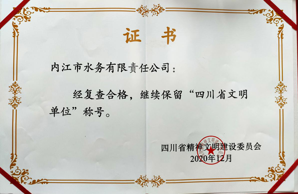 近年來,市水務(wù)公司黨委始終以*新時代中國特色社會主義思想為指導(dǎo),推進(jìn)精神文明建設(shè)工作不松勁,抓好生產(chǎn)經(jīng)營工作促發(fā)展,推動公司精神文明和物質(zhì)文明建設(shè)的雙豐收。根據(jù)四川省精神文明建設(shè)委員會《關(guān)于復(fù)查確認(rèn)繼續(xù)保留稱號的四川省文明城市、文明村鎮(zhèn)、文明單位、文明家庭、文明校園的通報》(川文明委〔2020〕20號),內(nèi)江市水務(wù)有限責(zé)任公司順利通過復(fù)查,繼續(xù)保留“四川省文明單位”榮譽(yù)稱號。