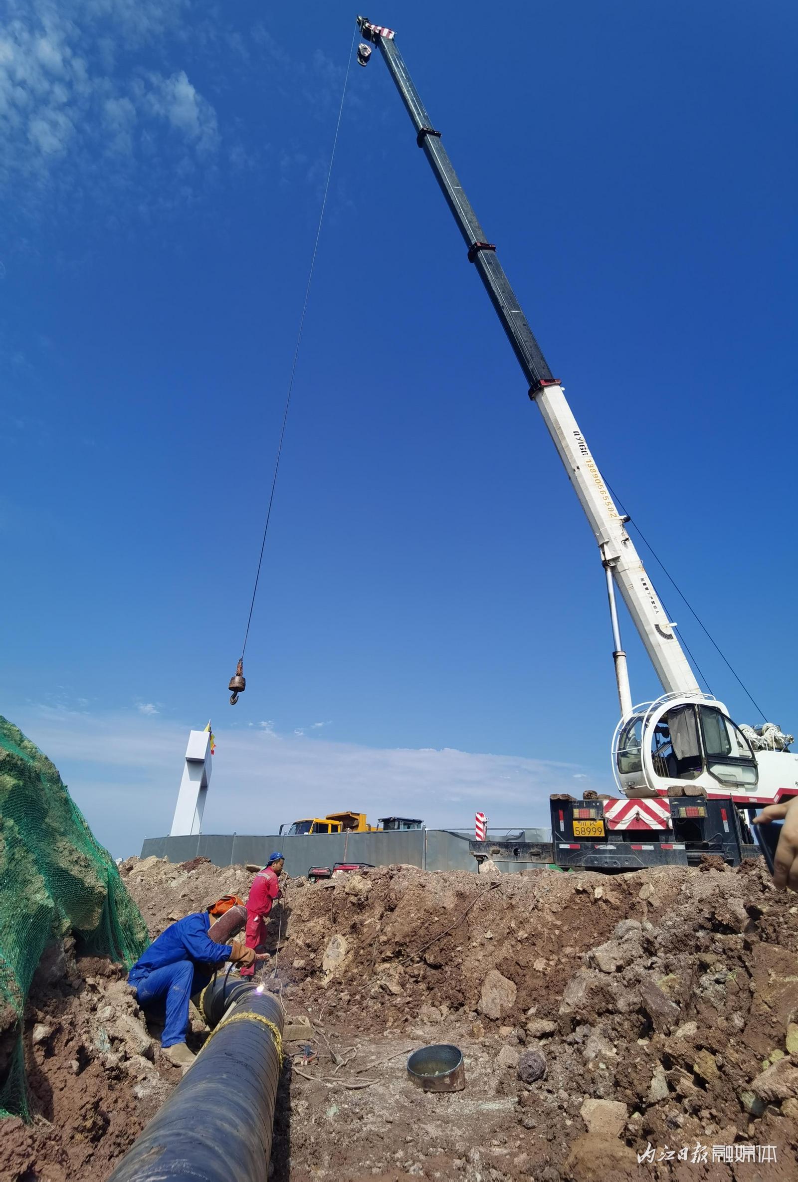 現(xiàn)場,機(jī)械聲轟鳴,大型挖掘機(jī)正在馬路邊開溝挖槽,大型吊車將管道吊到挖好的溝槽內(nèi),由施工人員逐節(jié)進(jìn)行焊接……分工明確,專業(yè)有序,白晃晃的陽光下,工人們揮汗如雨,衣服早已濕透。