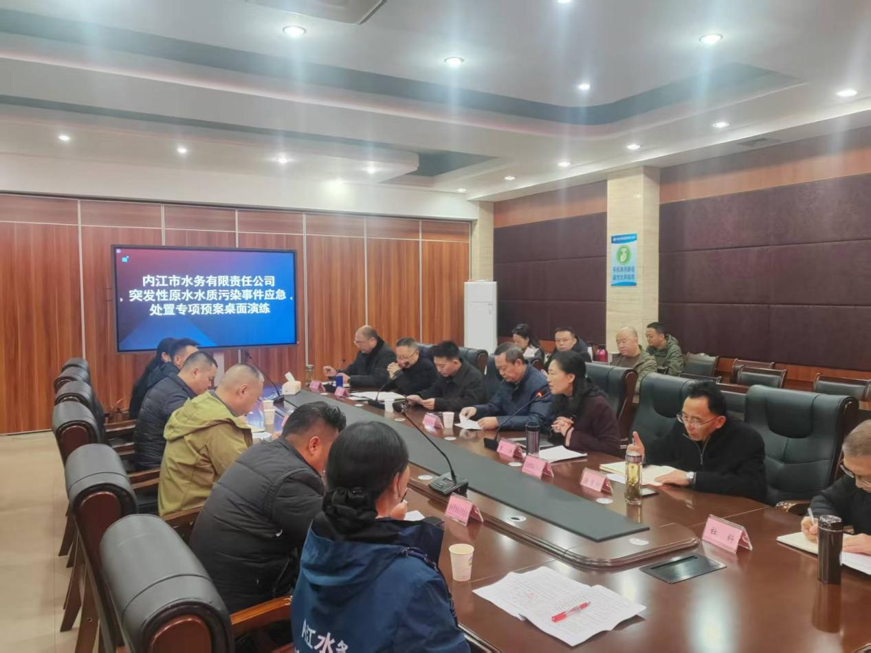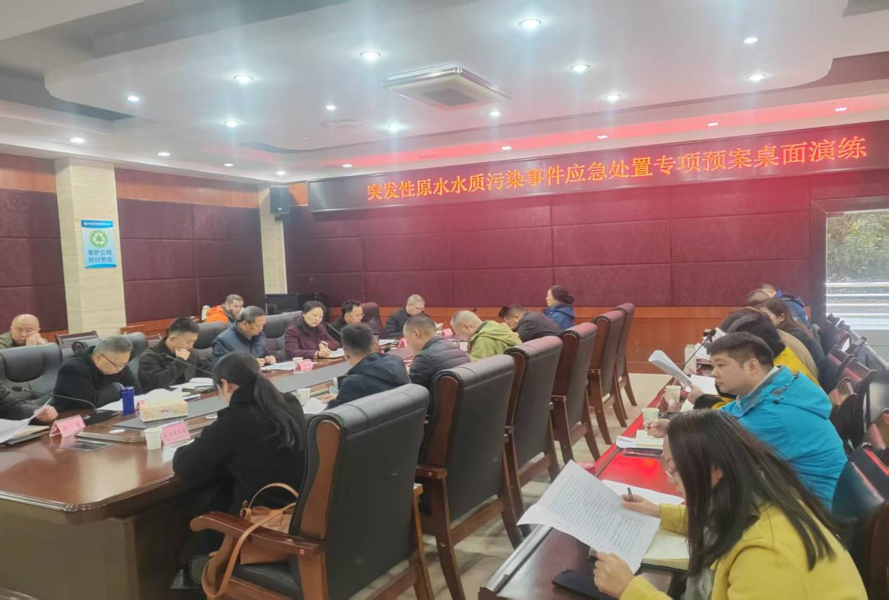 為提升公司應(yīng)對突發(fā)性原水水質(zhì)污染事件的處置能力,深刻吸取杭州余杭自來水異味事件的教訓(xùn),11月18日,市水務(wù)公司開展了突發(fā)性原水水質(zhì)污染應(yīng)急處置桌面演練。市住建局四級調(diào)研員吳志剛、公用事業(yè)科科長陳亮親臨現(xiàn)場進行指導(dǎo)。市水務(wù)公司黨委書記、董事長、總經(jīng)理李濤等公司班子成員以及公司相關(guān)部門人員參與了此次演練。