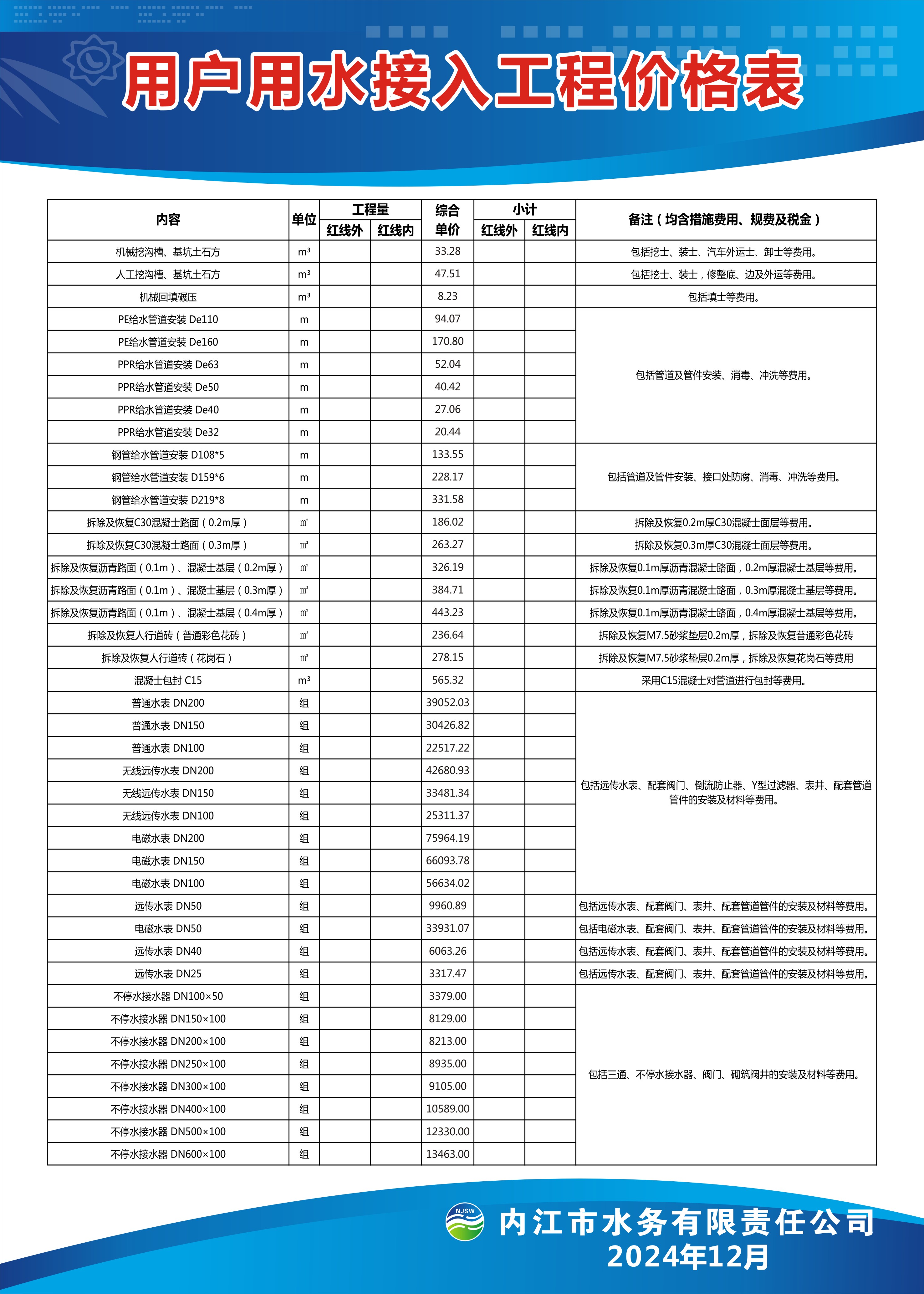 內(nèi)江市水務(wù)有限責(zé)任公司用戶用水接入工程價(jià)格表